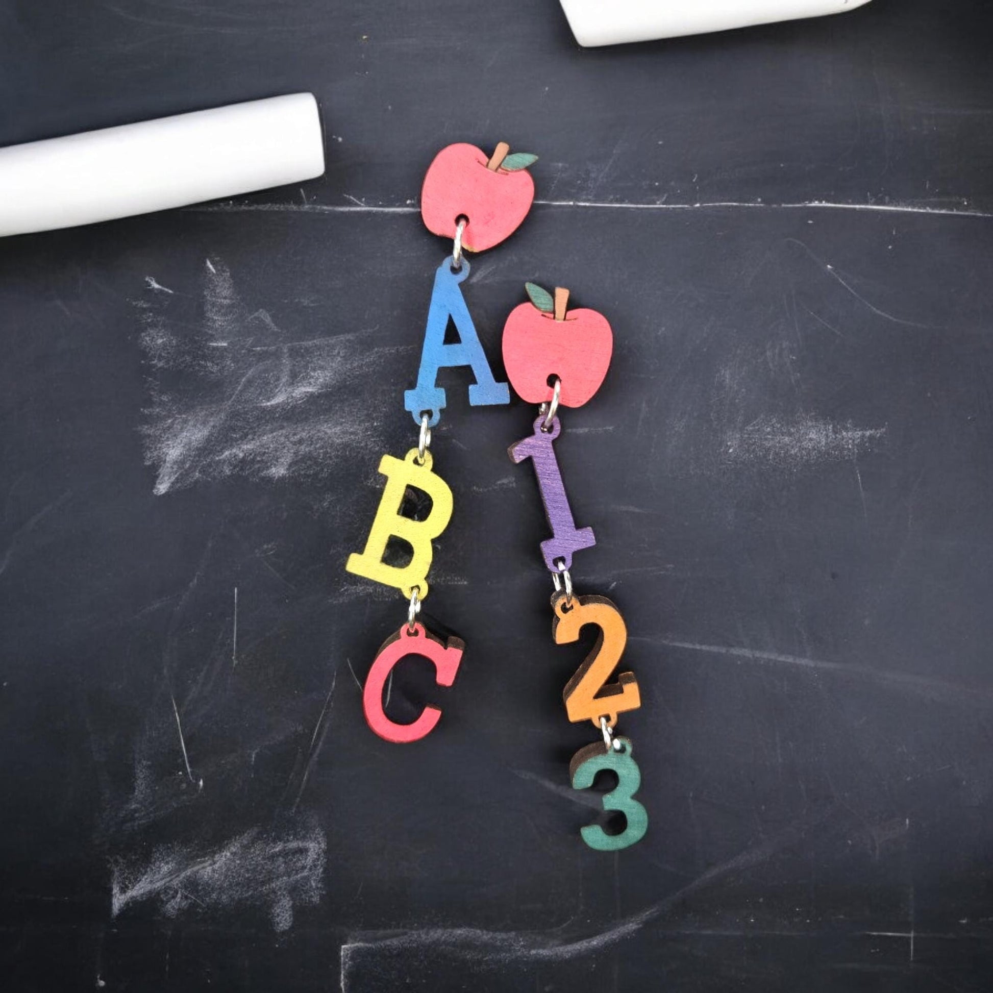 Celebrate the joy of learning with our ABC & 123 dangling earrings. These whimsical earrings feature an apple stud with "A, B, C" dangling on one side and "1, 2, 3" on the other, all laser-engraved and hand-painted to perfection. Perfect for teachers, students, and education enthusiasts, these earrings bring a playful yet stylish touch to any outfit.