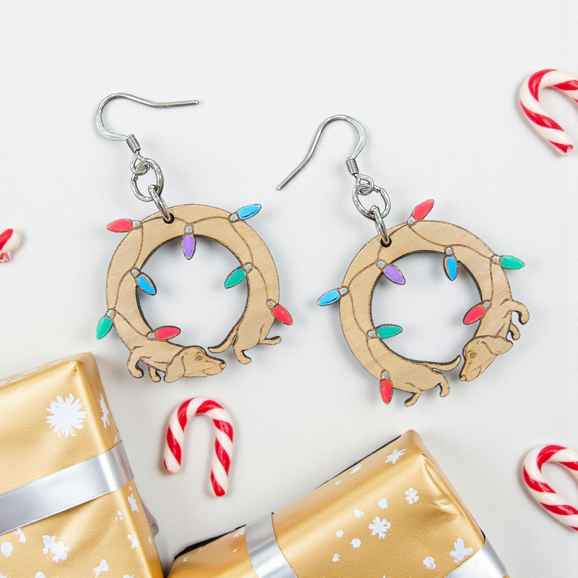 Add a playful touch of holiday cheer with these adorable holiday weenie light earrings! Each earring features a laser-cut dachshund wrapped into a festive wreath shape, complete with colorful holiday lights that sparkle with personality. Made from lightweight wood, these earrings are comfortable to wear all season long and bring a perfect blend of humor and holiday spirit to any outfit. Hand-painted with care, every pair captures the charm of the beloved “wiener dog” in a fun Christmas twist that’s sure to make everyone smile. Whether you’re shopping for a dog lover, looking for a unique holiday gift, or just want something cute to wear to your next Christmas party, these earrings are guaranteed to brighten the season.