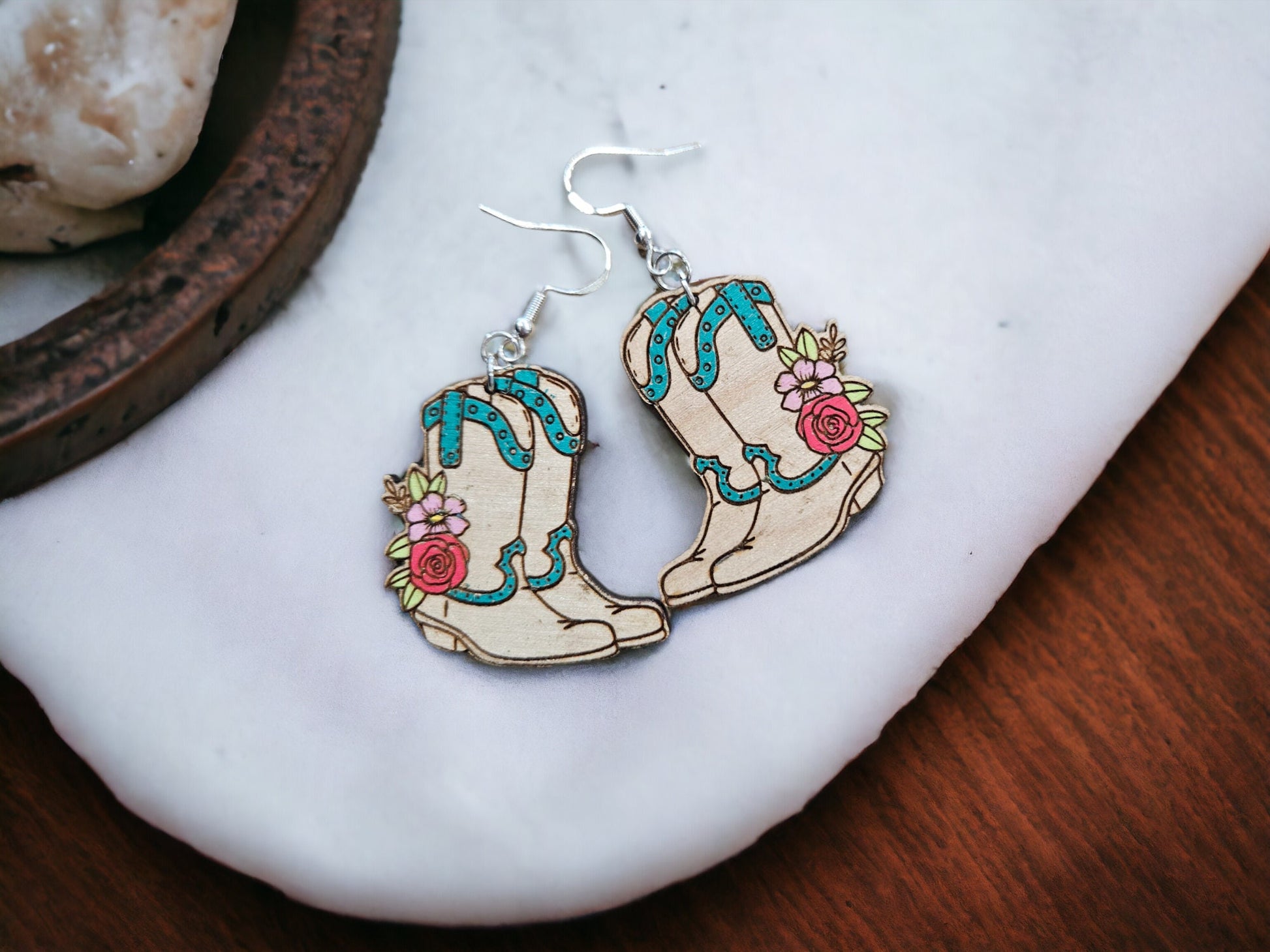 Tag words: cowboy boot earrings, western earrings, floral cowboy boots, hand-painted earrings, laser-engraved earrings, teal earrings, wood earrings, country style jewelry, rustic earrings, rodeo accessories, unique gift for her, lightweight earrings, western fashion, boho earrings, handmade jewelry