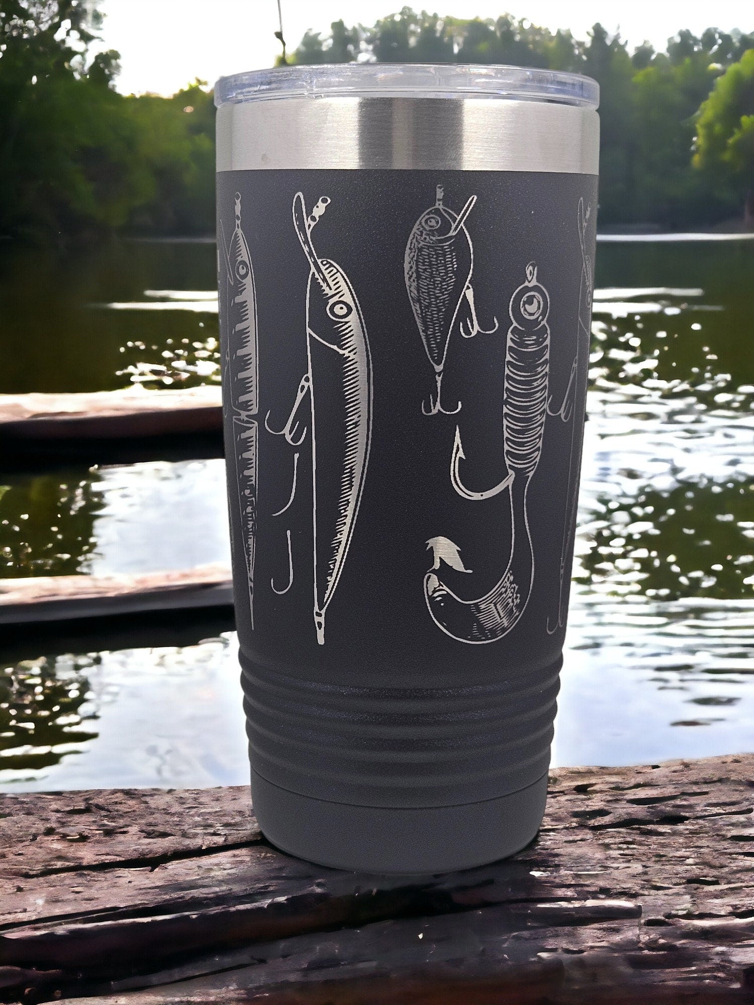 Introducing our fishing lure cup, the perfect accessory or gift for any fishing enthusiast! This 20 oz tumbler is made of durable stainless steel and features a sleek black design with a fun fish pattern. The slider lid ensures that your drink stays secure while you're out on the water, and the double-walled insulation keeps your beverage at the perfect temperature. Whether you're sipping coffee on the dock or enjoying a cold drink on the boat, this tumbler is the perfect companion for any fishing trip.