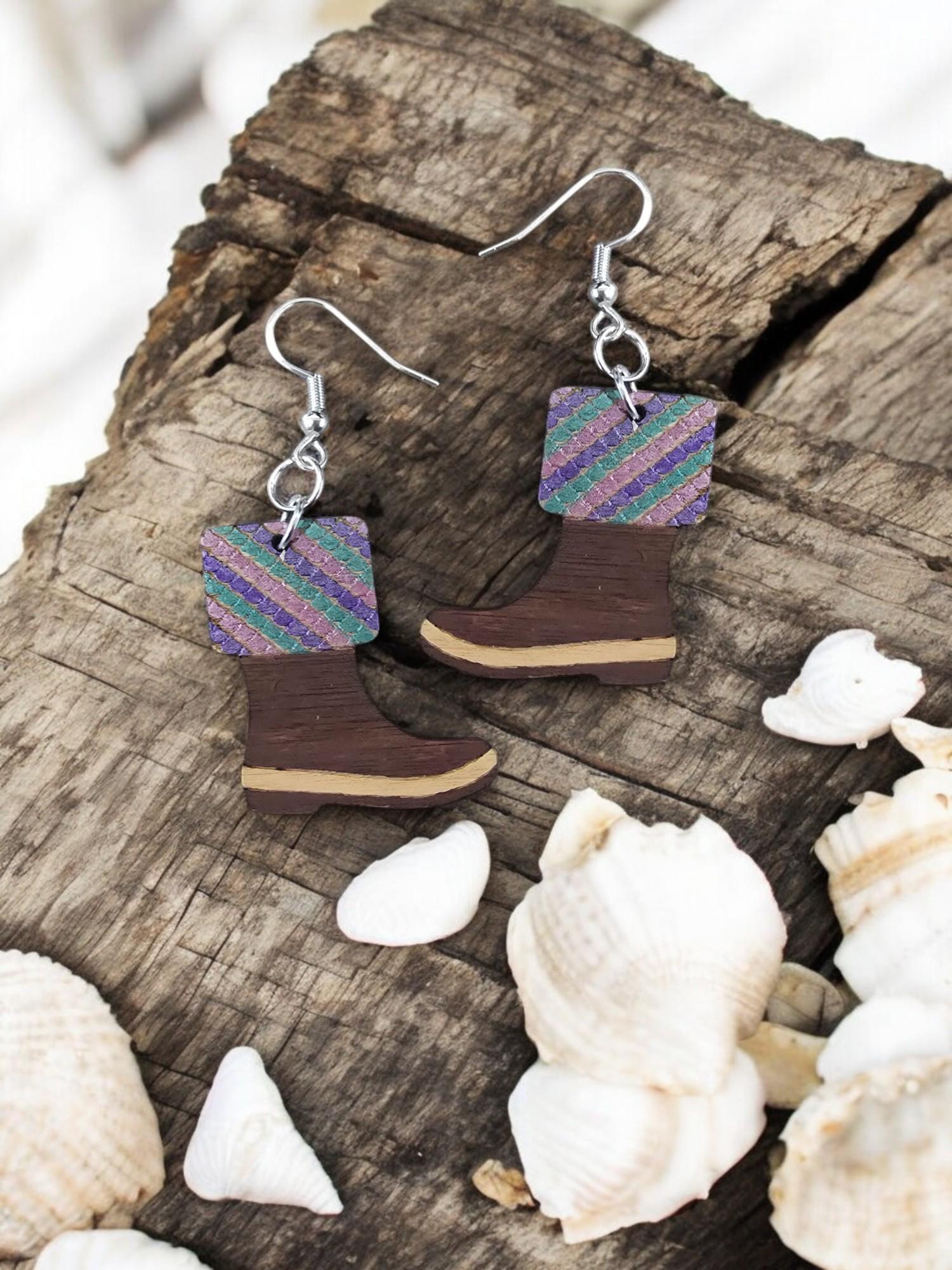 Add a splash of whimsy to your jewelry collection with these mermaid scale rubber boot earrings! Perfect for ocean lovers and fashionistas alike, these unique earrings are laser engraved and hand-painted with intricate details. The upper portion features a beautiful mermaid scale design, adding a magical touch to the rustic charm of the rubber boot shape. Available in both solid and metallic color options, you can choose between a classic look or an iridescent shimmer for extra flair. Whether you're heading to a festival, a beach vacation, or simply want to add some fun to your outfit, these charming boots are sure to turn heads. They make a fantastic gift for mermaid lovers, beachgoers, and anyone who enjoys unique accessories.