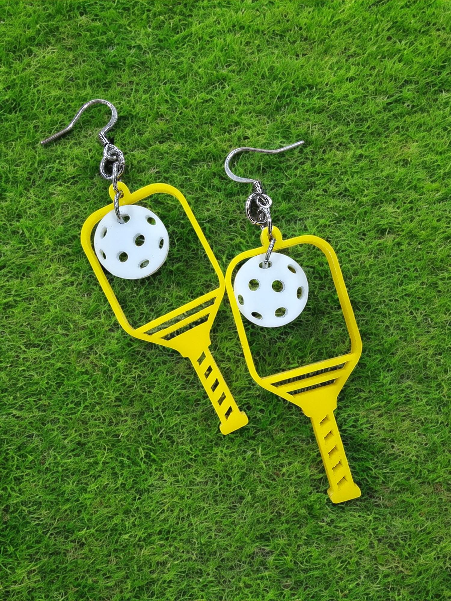 Show off your love for the game with these playful acrylic pickleball paddle earrings, available in three vibrant colors—turquoise, yellow, and lime green. Each pair features a lightweight laser-cut paddle design paired with a dangling perforated ball, making them the perfect accessory for pickleball lovers both on and off the court. These earrings are made from durable acrylic and finished with hypoallergenic stainless steel hooks for comfortable, all-day wear. Whether you're heading to a tournament, coaching a team, or just want to add some sporty charm to your everyday look, these earrings are a fun and stylish choice. They also make a thoughtful gift for players, fans, or coaches of the fastest-growing sport around.