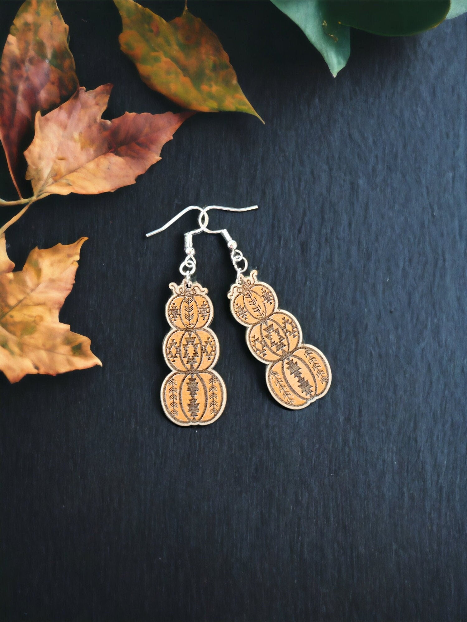 Looking for a unique and stylish accessory to add to your collection? Check out these Aztec stacked pumpkin dangle earrings! These earrings feature a fun and festive design that's perfect for fall. The pumpkins are stacked on top of each other, creating a playful and eye-catching look. The Aztec-inspired pattern adds a touch of bohemian flair to these earrings, making them perfect for any occasion. Whether you're dressing up for a night out or just adding a fun accessory to your everyday look, these earrings are sure to impress. So why wait? Add them to your collection today!